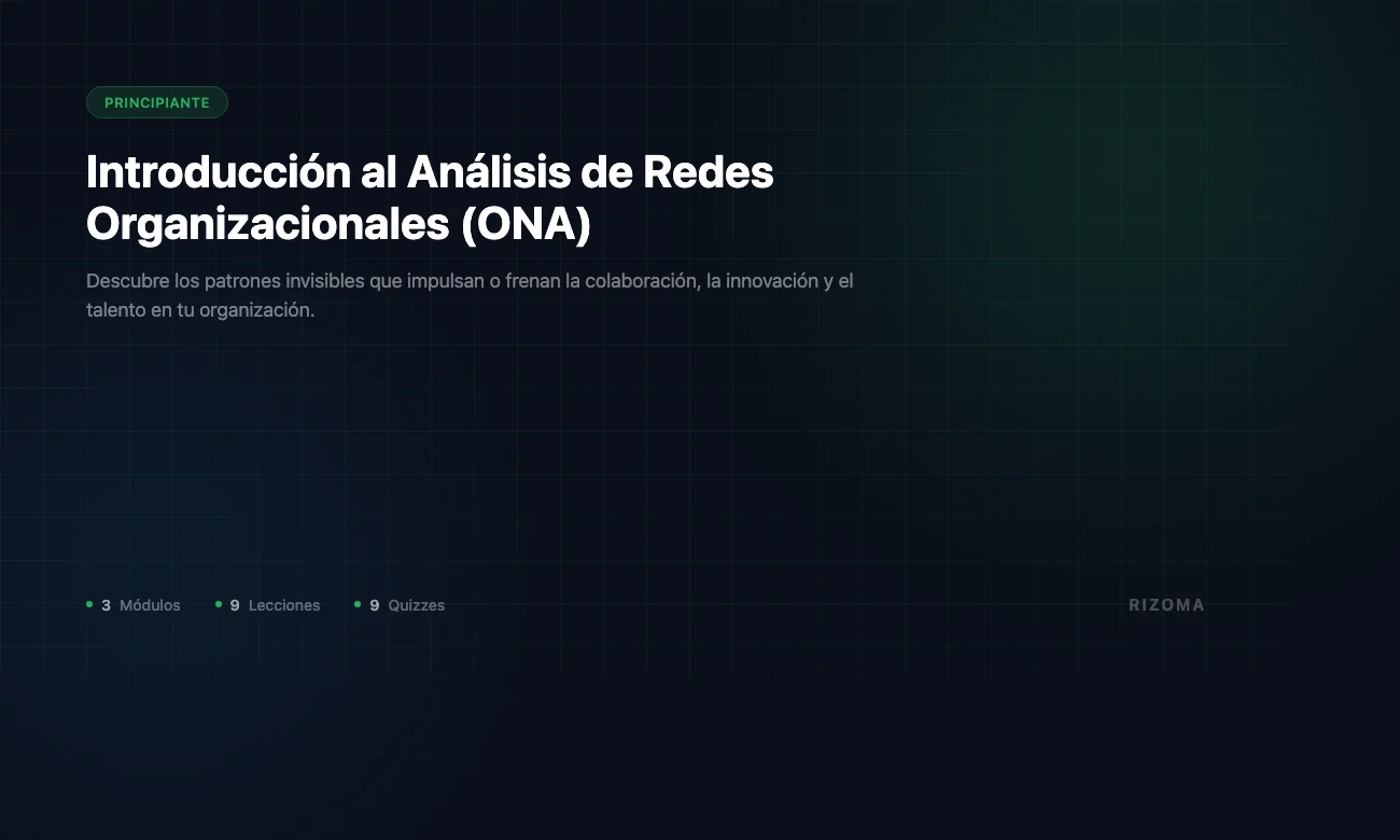 Descubre por qué el organigrama no refleja cómo realmente funciona tu organización y cómo el Análisis de Redes Organizacionales (ONA) revela los patrones invisibles que impulsan o frenan la colaboración, la innovación y el talento. A través de casos reales de organizaciones en Latinoamérica, aprenderás a identificar roles ocultos, diagnosticar silos y dependencias críticas, y diseñar un plan de implementación de ONA. No requiere programación ni conocimientos técnicos previos.